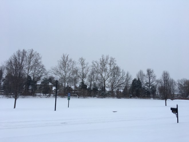 I’m sharing some pictures from today – the first one is the View from our front yard and the next one is to show you how much snow we got today.